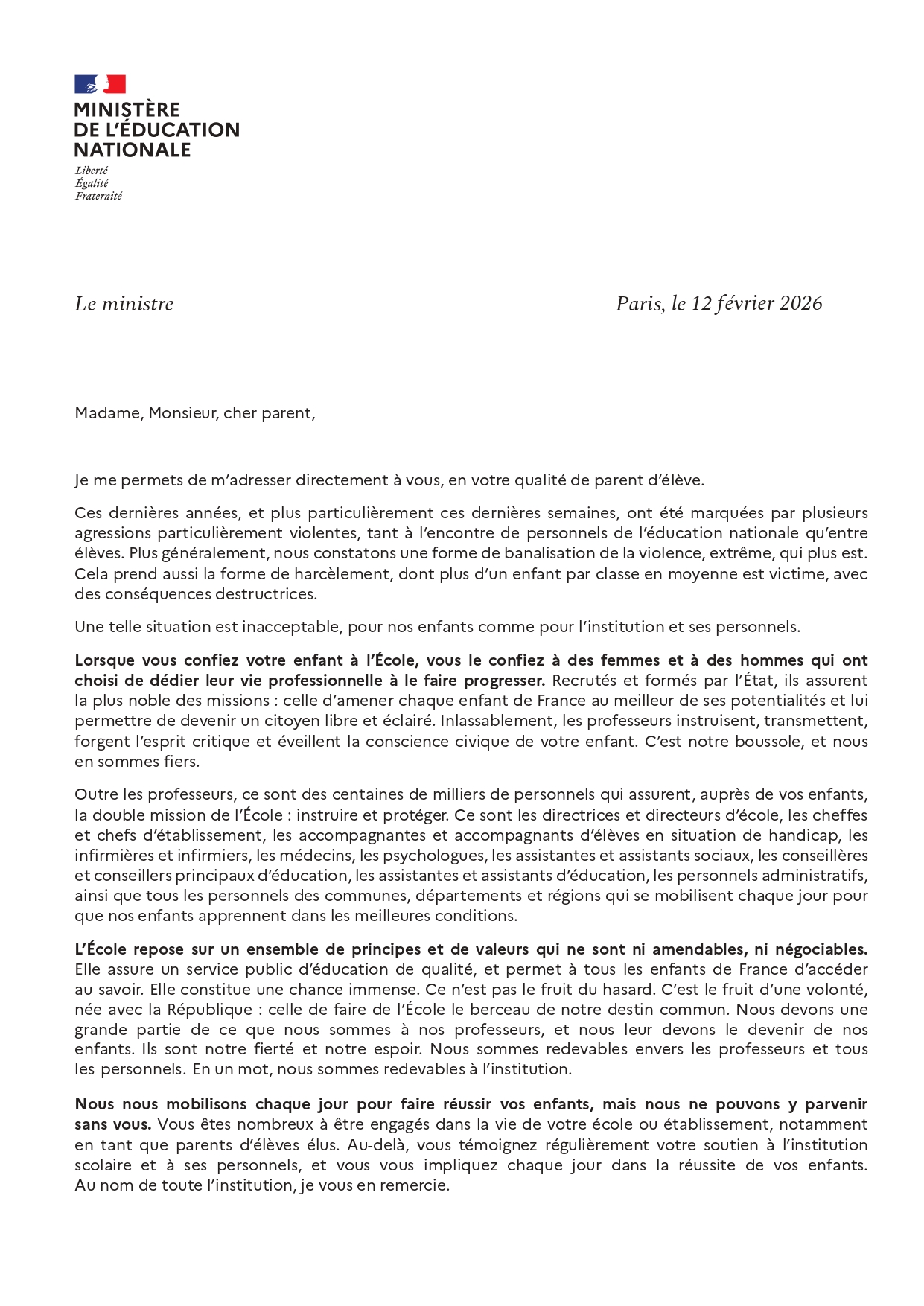 Lettre du Ministre de l'Éducation Nationale
